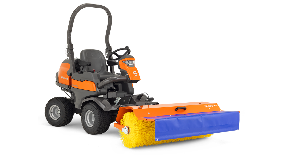 Kraftfull roterande borste för att borsta löv, grus, snö etc. Vinklas lätt åt båda håll från kontrollpanelen vid förarplatsen. Två bakre solida stödhjul följer markytan. Kräver att frontrotorklipparen har utrustats med kablagesats för elektriska tillbehör.